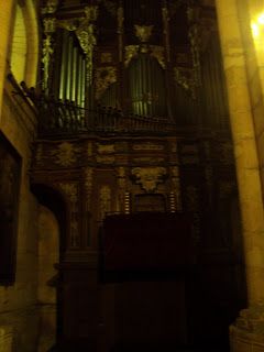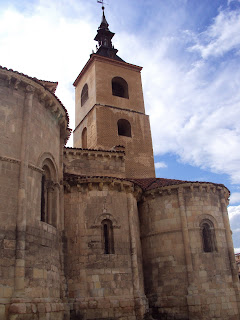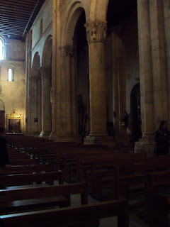 For our excursion though, we went and looked at Iglesia Románicas, Romanesque churches. So although todays coursework did not match up with our excursion- we will be covering la arte Románica in the next day or so. Romanesque churches have "arcos medios puntos" which are rounded arches which you can see in the photos below. They also have alters that face the east, so it is like parishioners are coming from the darkness (the west) towards the light of God (the east). In the first church we saw, la iglesia de San Millan, there were only windows on the south side of the building, not the north. This is apparently because the north is the side of death and the south the side of life. The churches are made out of stone and have wood ceilings. The walls are extremely thick because people did not know how else to build sturdy walls to hold up such heavy ceilings at the time. Their are also pillars and columns that creates "naves" which are like aisles. Fresco painting also covered much of the Romanesque church's walls. A lot of it has been destroyed or lost by now, but you can see some of it in photos from both of the churches we went to. Both churches also had towers and atriums. This is about all I can remember about la iglesias Románicas from out tour, like I said we have not taken notes on them yet in class. But we will be going to see one or two more of these types of churches a different day, so if I forgot anything I will add it then!